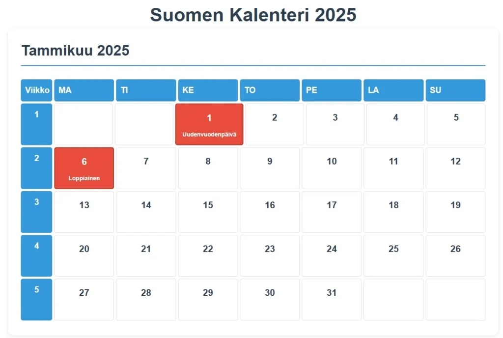 Suomalainen Kalenteri 2025 Suomen Kalenteri 2025 Viikkokalenteri 2025: Viikot on numeroitu numerolla sarakkeessa (Viikko). Punaisella korostetut päivät ovat yleisiä pyhäpäiviä